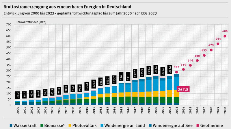 Trotz dieser positiven Entwicklung bleiben die Herausforderungen groß: Um die Energie- und Klimaziele der Bundesregierung zu erfüllen, sollen bis zum Jahr 2030 80 % unseres Bruttostromverbrauchs aus erneuerbaren Quellen gedeckt werden. Dafür muss nach derzeitigen Abschätzungen die erneuerbare Stromerzeugung auf etwa 600 Terawattstunden (600 Mrd. Kilowattstunden) steigen und sich damit mehr als verdoppeln, um auch die steigenden Bedarfe der Elektrifizierung des Wärmesektors und des Verkehrs zu decken.