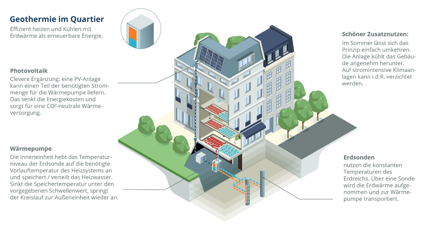 Die Erdkruste speichert Energie, konstant und über das ganze Jahr hinweg. In Deutschland steigt die Temperatur pro 100 Meter Tiefe um durchschnittlich 3 Grad Celsius. Diesen Temperaturunterschied zur Oberfläche nutzt die Geothermie. Dabei wird die Wärme angezapft und z. B. mittels Wärmetauscher an eine Wärmepumpe übergeben. Einer der größten Vorteile der Geothermie: Erdwärme ist unabhängig von Wettereinflüssen und bietet damit im Gegensatz zur Umgebungsluft verlässlich konstante Temperaturen. Deshalb warten Wärmepumpen mit Erdsonden in der Regel auch mit höheren Wirkungsgraden auf als Luftwärmepumpen. Während Windräder oder Photovoltaikanlagen auf Wind beziehungsweise Sonne angewiesen sind, um Energie erzeugen zu können, liefert Geothermie das ganze Jahr über nahezu ununterbrochen umweltfreundliche Wärme oder Strom. Das nutzen auch Geothermiekraftwerke, die Wärme aus dem Erdreich in Strom umwandeln und den Verbrauchern zur Verfügung stellen. Diese Art der Stromerzeugung ist sogar grundlastfähig. Eine Geothermieanlage kann also konstant und saisonunabhängig Wärme oder Strom bereitstellen. In der Steglitzer Albrechtstraße 23 entsteht ein Neubau, der künftig mit Geothermie beheizt wird. Hierzu werden 35 Erdwärmesonden in einer Tiefe von ca. 99 Metern installiert, die dann eine Sole-Wasser-Wärmepumpe versorgen, um die geplanten 65 Wohnungen, einen großen Supermarkt und weitere Gewerbeflächen zu beheizen. Das Projekt beweist: Geothermie ist auch in dicht besiedelten Gebieten wie dem Berliner Stadtgebiet ein probates Mittel für eine klimafreundliche Wärmeversorgung.